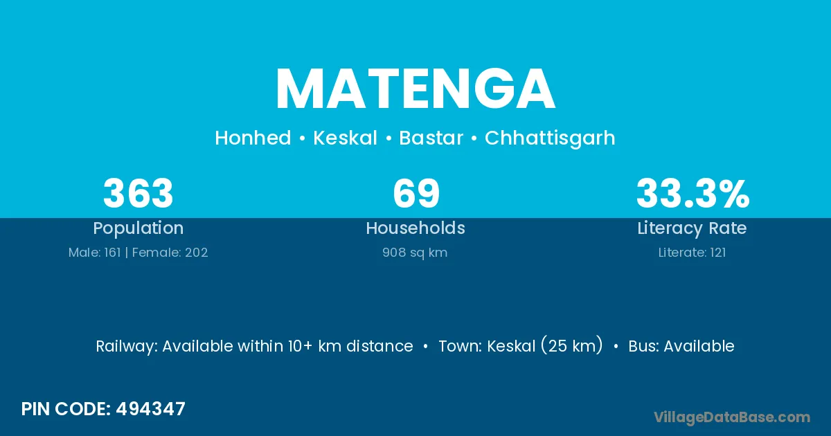 Keskal (25 km) is the nearest town to Matenga village for major economic activities and is located approximately 25 km away.