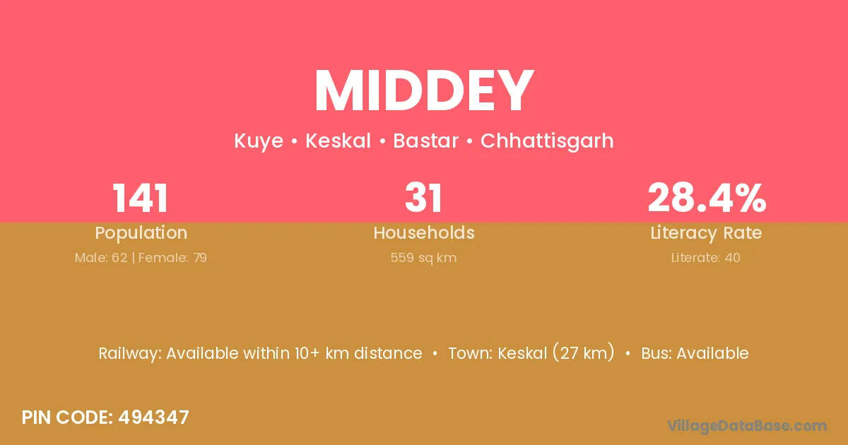 Keskal (27 km) is the nearest town to Middey village for major economic activities and is located approximately 27 km away.