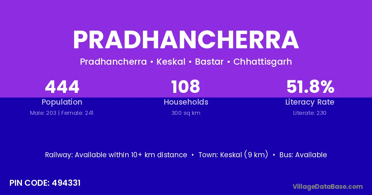 Keskal (9 km) is the nearest town to Pradhancherra village for major economic activities and is located approximately 9 km away.