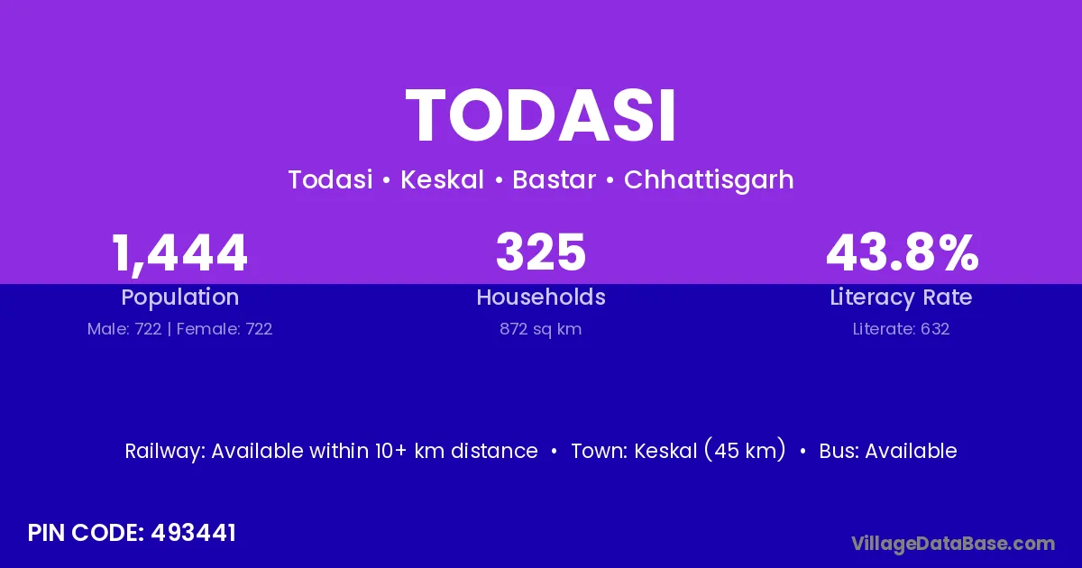 Keskal (45 km) is the nearest town to Todasi village for major economic activities and is located approximately 45 km away.
