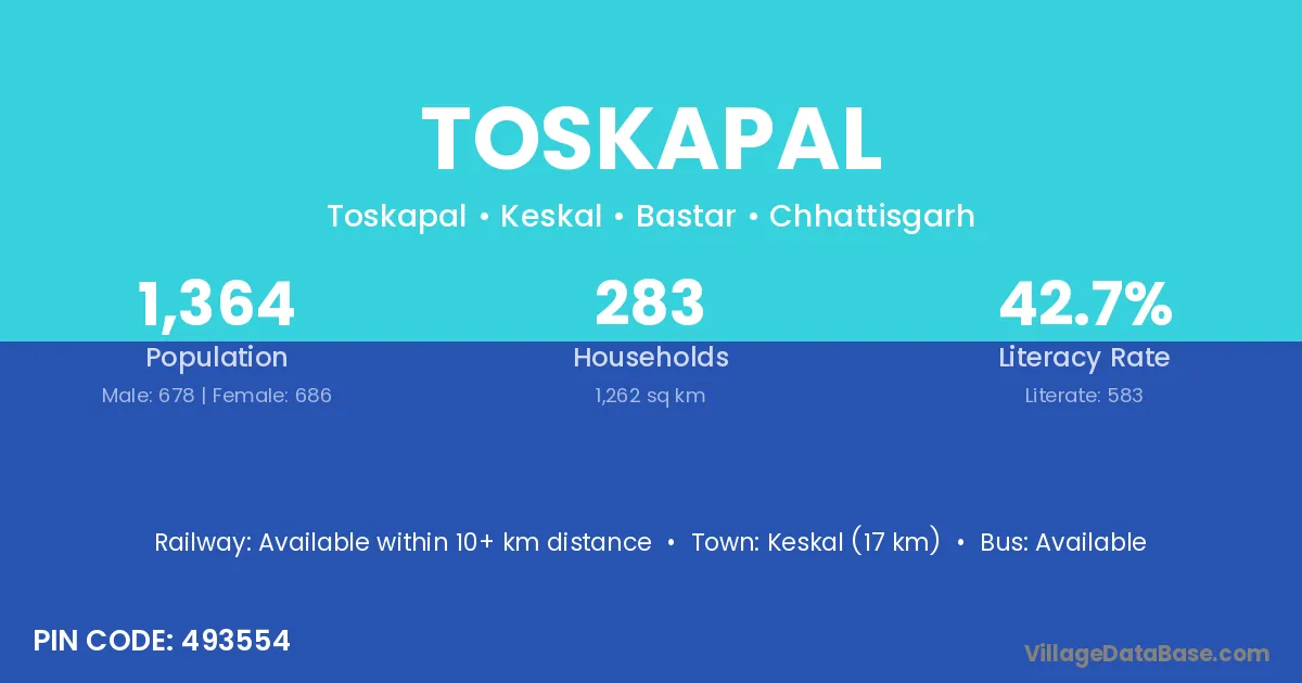 Keskal (17 km) is the nearest town to Toskapal village for major economic activities and is located approximately 17 km away.