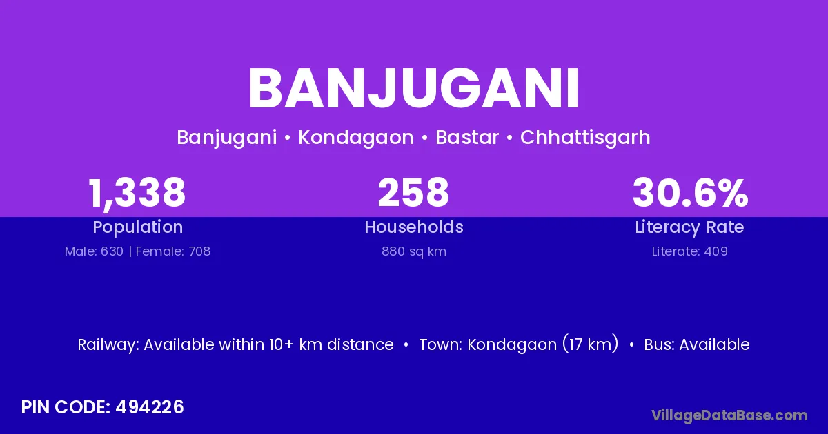 Kondagaon (17 km) is the nearest town to Banjugani village for major economic activities and is located approximately 17 km away.