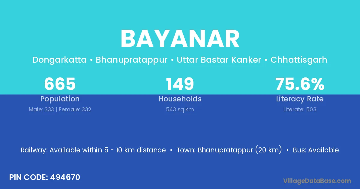 Kondagaon (50 km) is the nearest town to Bayanar village for major economic activities and is located approximately 50 km away.