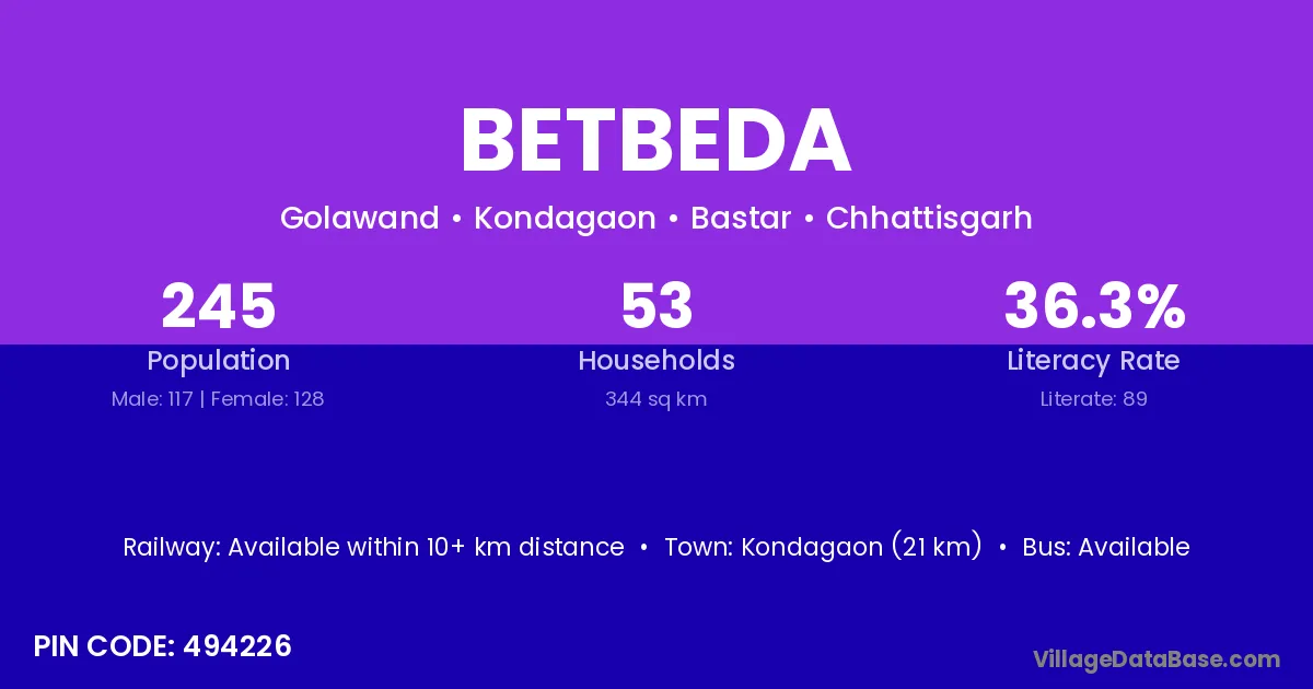 Kondagaon (21 km) is the nearest town to Betbeda village for major economic activities and is located approximately 21 km away.