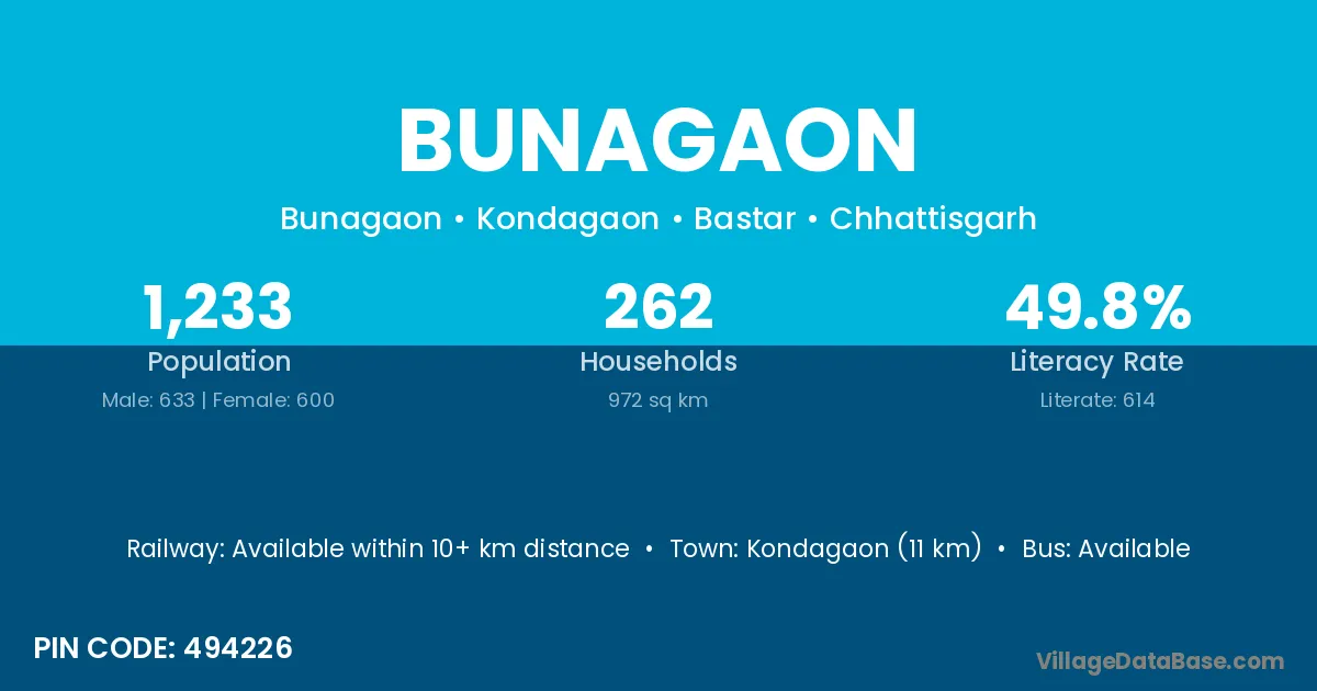 Kondagaon (11 km) is the nearest town to Bunagaon village for major economic activities and is located approximately 11 km away.