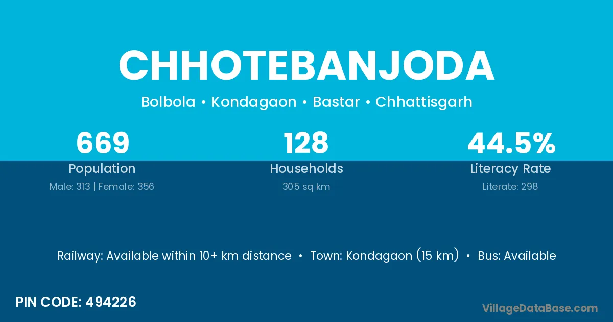 Kondagaon (15 km) is the nearest town to Chhotebanjoda village for major economic activities and is located approximately 15 km away.