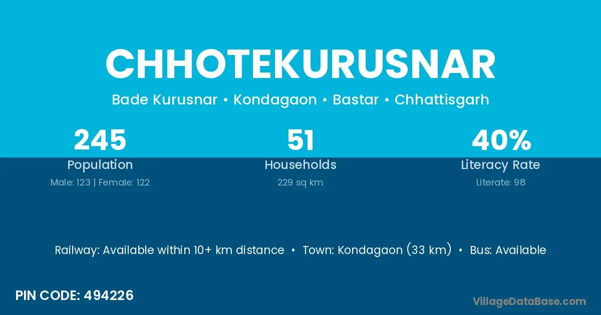 Chhotekurusnar village has a total population of 245 people, of which 123 are males and 122 are females.