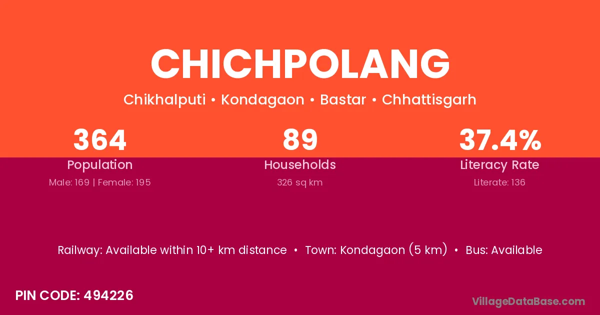 Kondagaon (5 km) is the nearest town to Chichpolang village for major economic activities and is located approximately 5 km away.