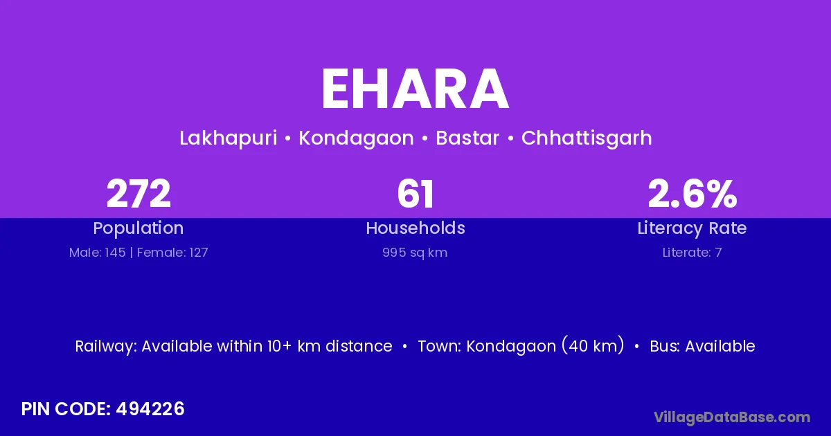 Kondagaon (40 km) is the nearest town to Ehara village for major economic activities and is located approximately 40 km away.