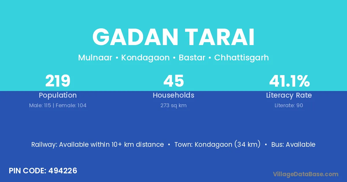 Kondagaon (34 km) is the nearest town to Gadan Tarai village for major economic activities and is located approximately 34 km away.