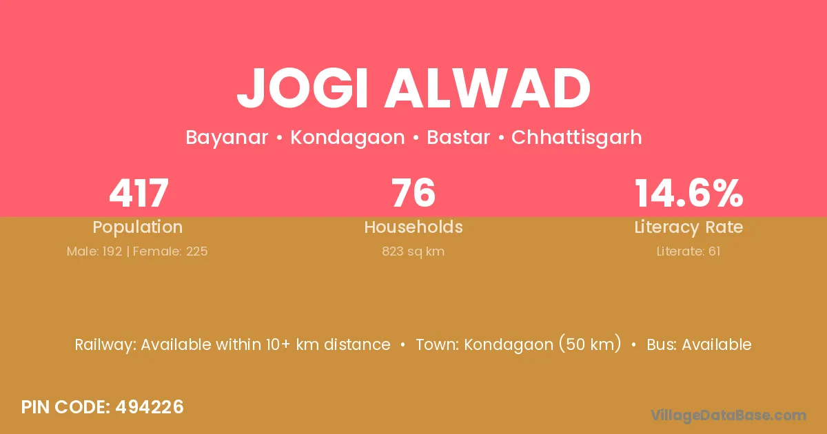 Kondagaon (50 km) is the nearest town to Jogi Alwad village for major economic activities and is located approximately 50 km away.