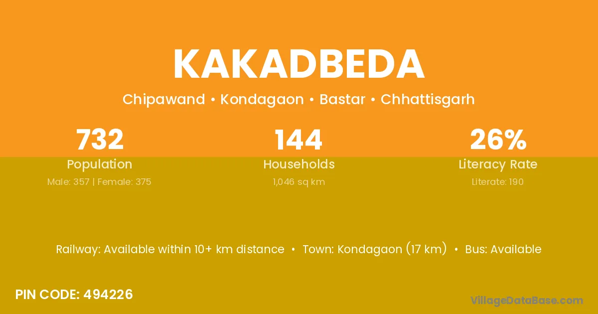 Kondagaon (17 km) is the nearest town to Kakadbeda village for major economic activities and is located approximately 17 km away.