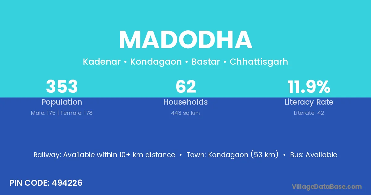 Kondagaon (53 km) is the nearest town to Madodha village for major economic activities and is located approximately 53 km away.