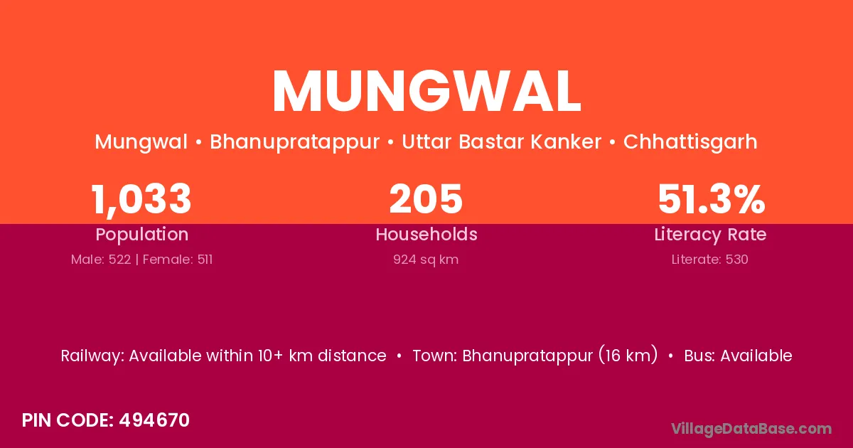 Kondagaon (45 km) is the nearest town to Mungwal village for major economic activities and is located approximately 45 km away.