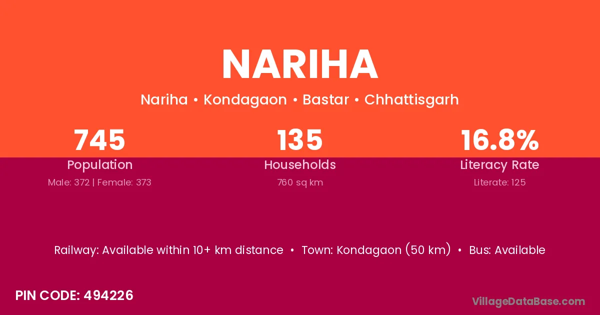 Kondagaon (50 km) is the nearest town to Nariha village for major economic activities and is located approximately 50 km away.