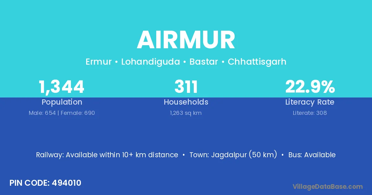 Jagdalpur (50 km) is the nearest town to Airmur village for major economic activities and is located approximately 50 km away.