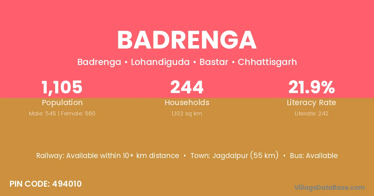Jagdalpur (55 km) is the nearest town to Badrenga village for major economic activities and is located approximately 55 km away.