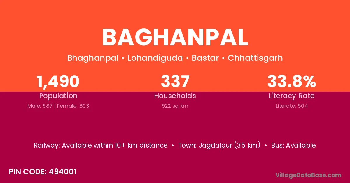 Jagdalpur (35 km) is the nearest town to Baghanpal village for major economic activities and is located approximately 35 km away.