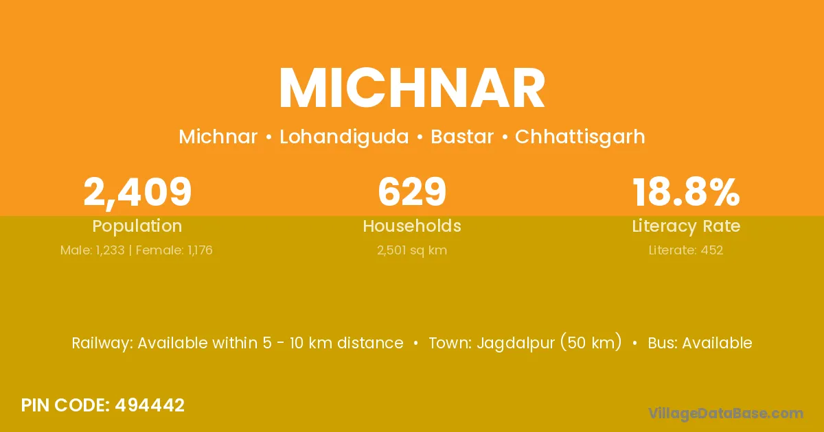 Jagdalpur (50 km) is the nearest town to Michnar village for major economic activities and is located approximately 50 km away.