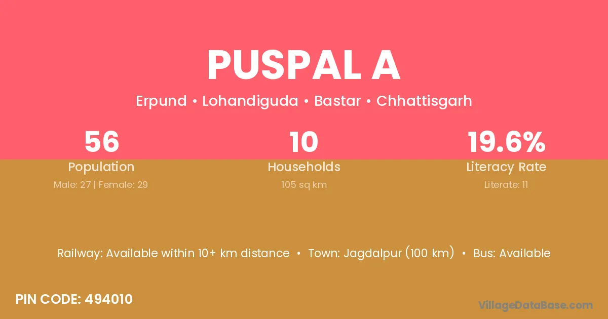 Jagdalpur (100 km) is the nearest town to Puspal A village for major economic activities and is located approximately 100 km away.