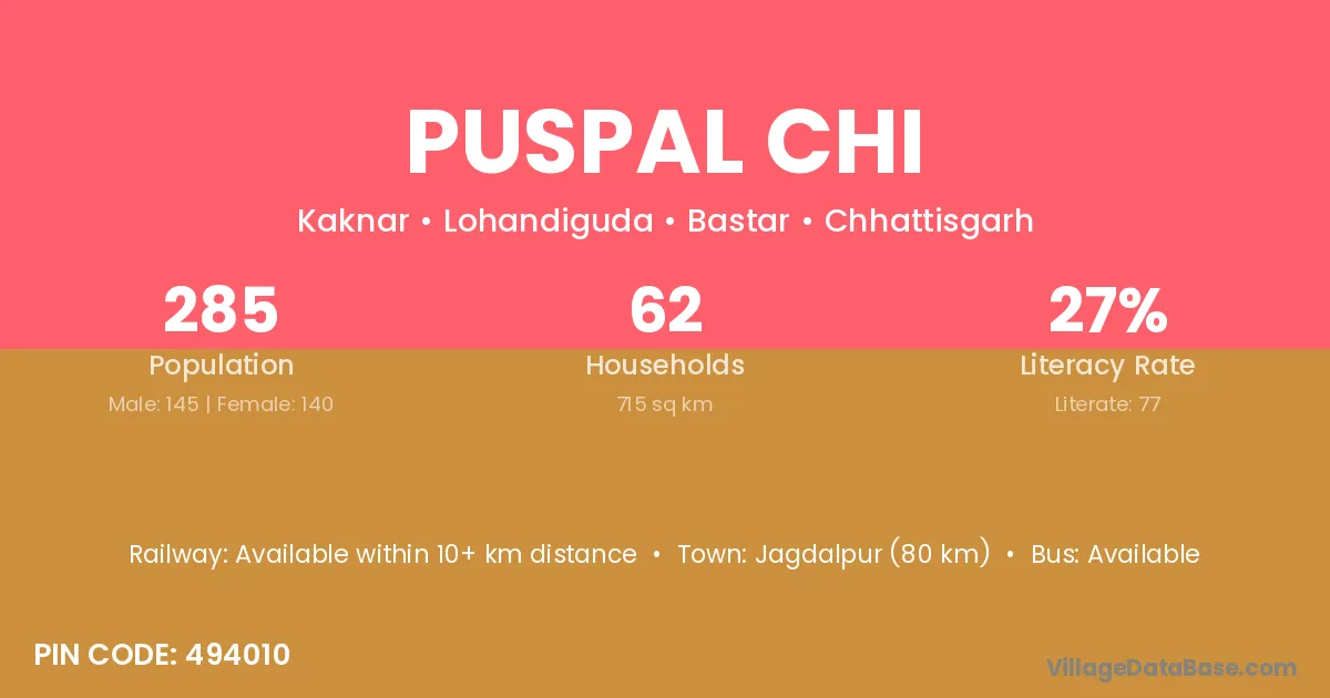 Puspal Chi village has a total population of 285 people, of which 145 are males and 140 are females.