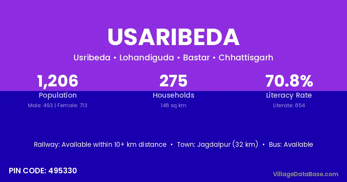 Jagdalpur (32 km) is the nearest town to Usaribeda village for major economic activities and is located approximately 32 km away.