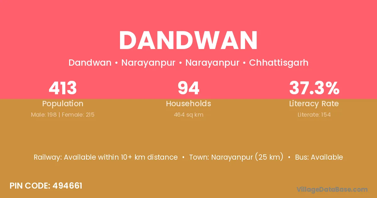 Kondagaon (28 km) is the nearest town to Dandwan village for major economic activities and is located approximately 28 km away.