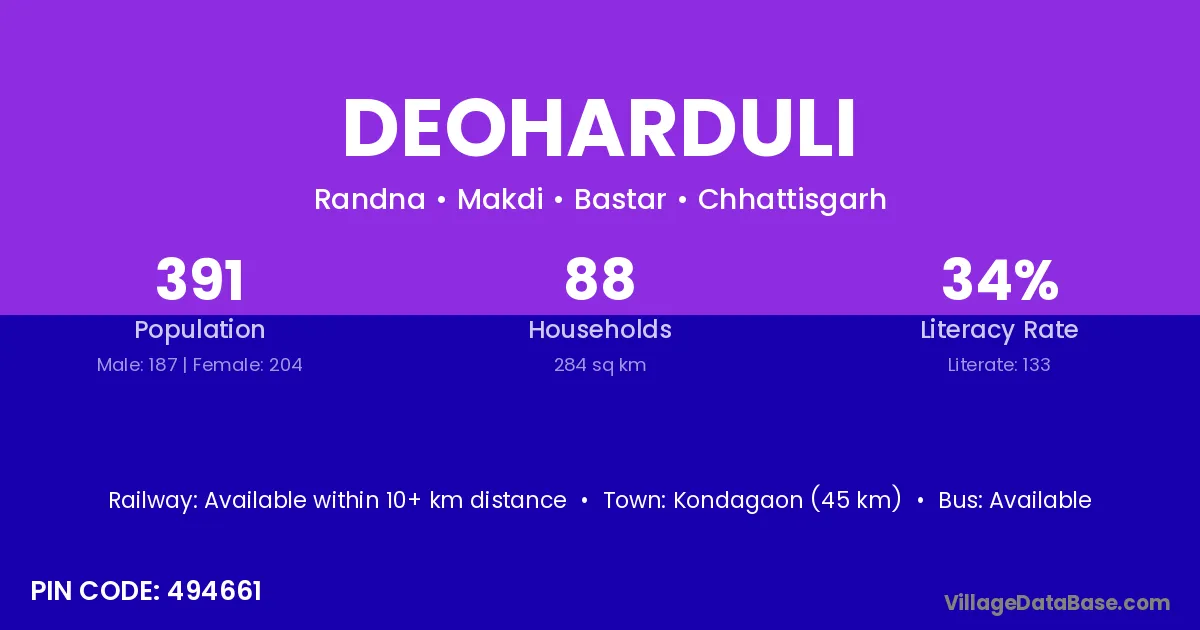 Kondagaon (45 km) is the nearest town to Deoharduli village for major economic activities and is located approximately 45 km away.