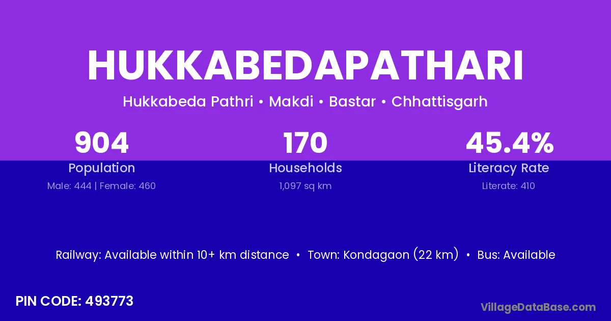 Kondagaon (22 km) is the nearest town to Hukkabedapathari village for major economic activities and is located approximately 22 km away.
