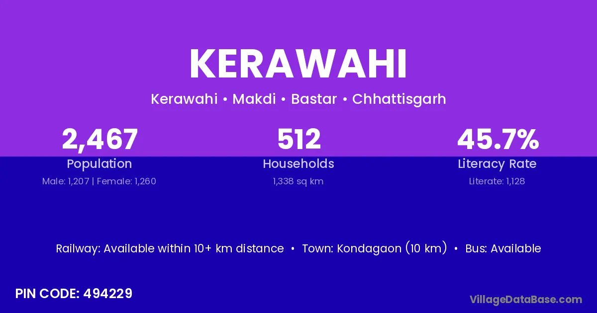 Kondagaon (10 km) is the nearest town to Kerawahi village for major economic activities and is located approximately 10 km away.