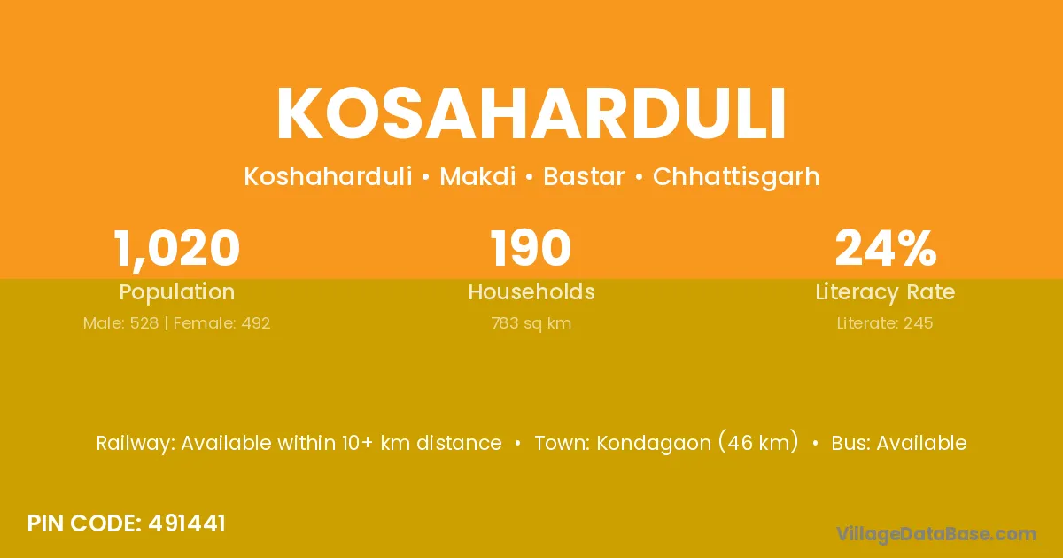 Kondagaon (46 km) is the nearest town to Kosaharduli village for major economic activities and is located approximately 46 km away.