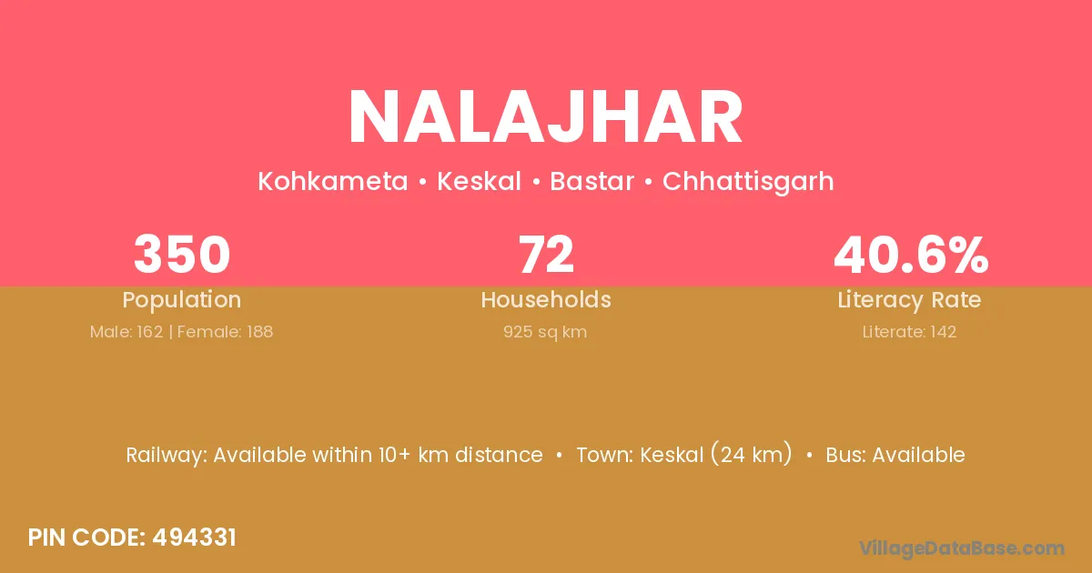 Kondagaon (40 km) is the nearest town to Nalajhar village for major economic activities and is located approximately 40 km away.