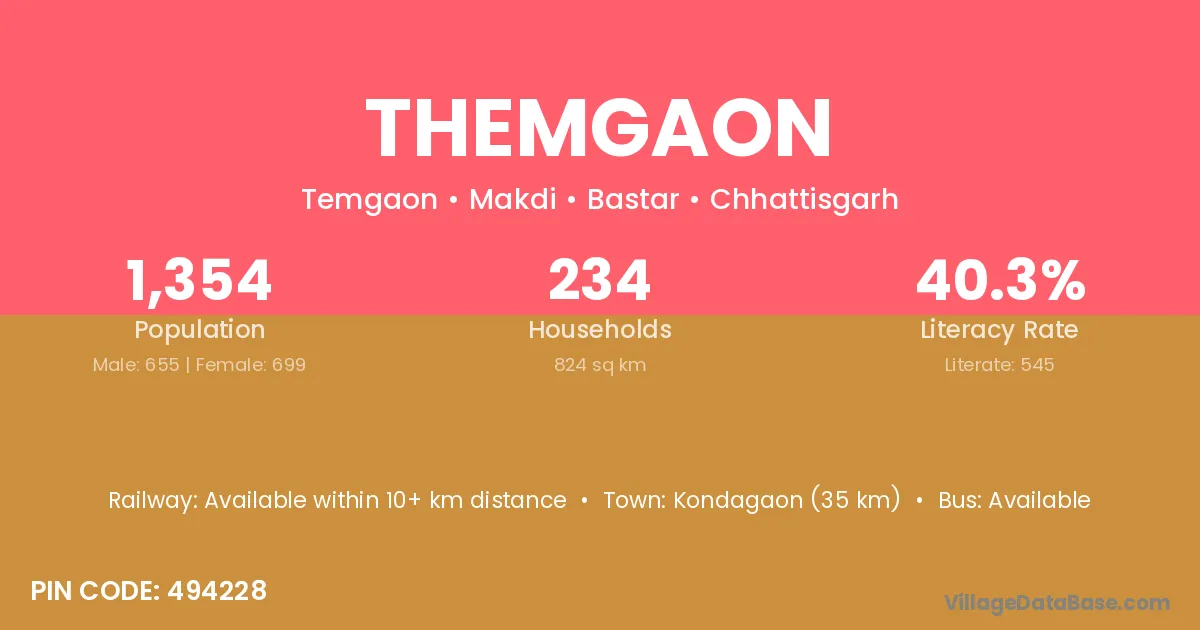 Kondagaon (35 km) is the nearest town to Themgaon village for major economic activities and is located approximately 35 km away.