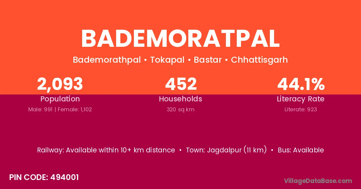 Jagdalpur (11 km) is the nearest town to Bademoratpal village for major economic activities and is located approximately 11 km away.