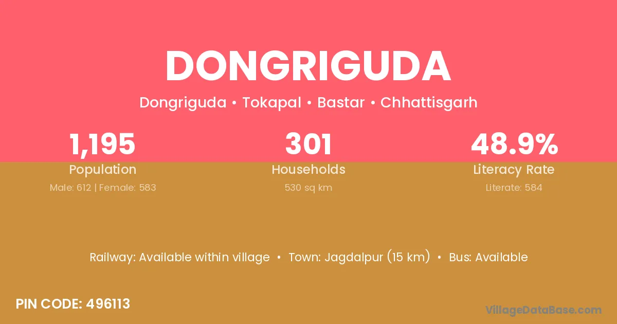 Jagdalpur (15 km) is the nearest town to Dongriguda village for major economic activities and is located approximately 15 km away.