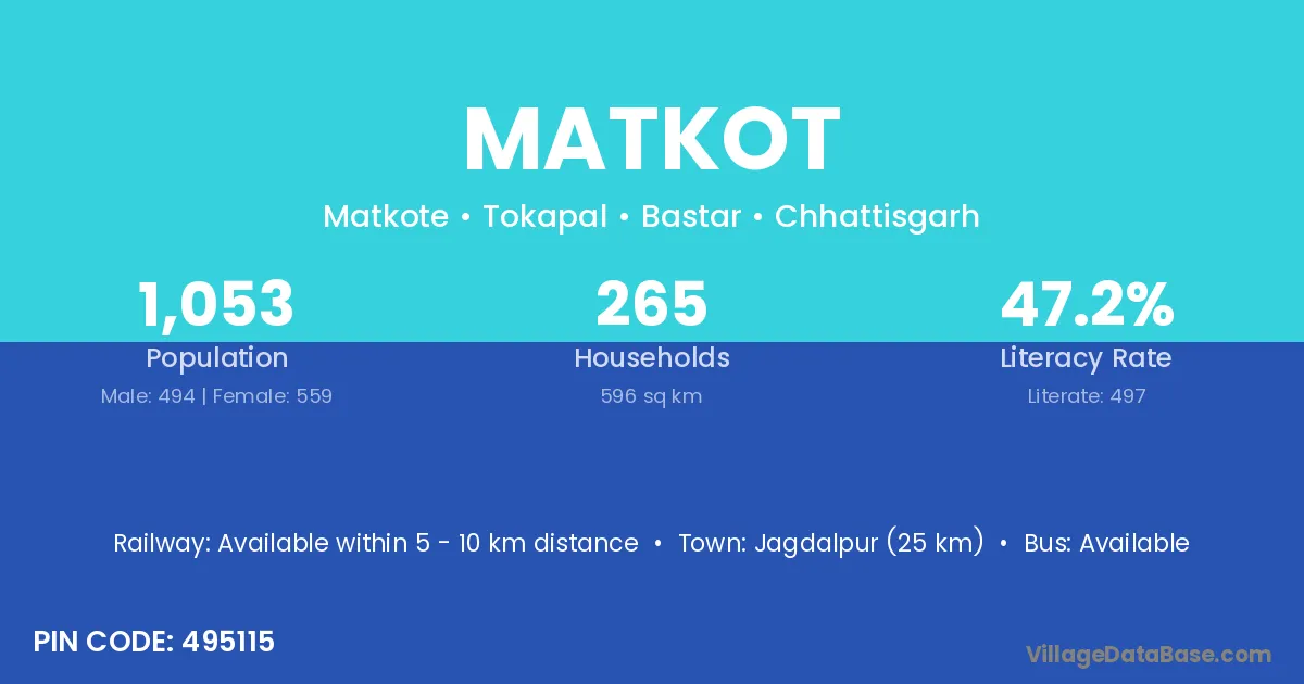 Jagdalpur (25 km) is the nearest town to Matkot village for major economic activities and is located approximately 25 km away.