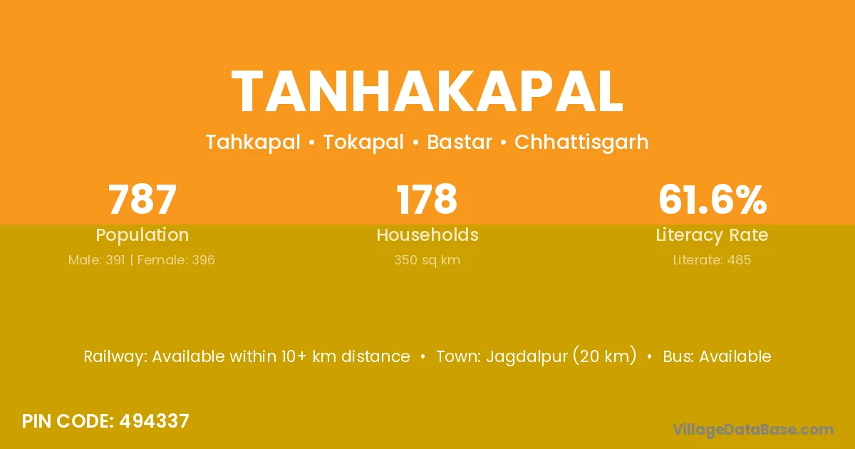Jagdalpur (20 km) is the nearest town to Tanhakapal village for major economic activities and is located approximately 20 km away.
