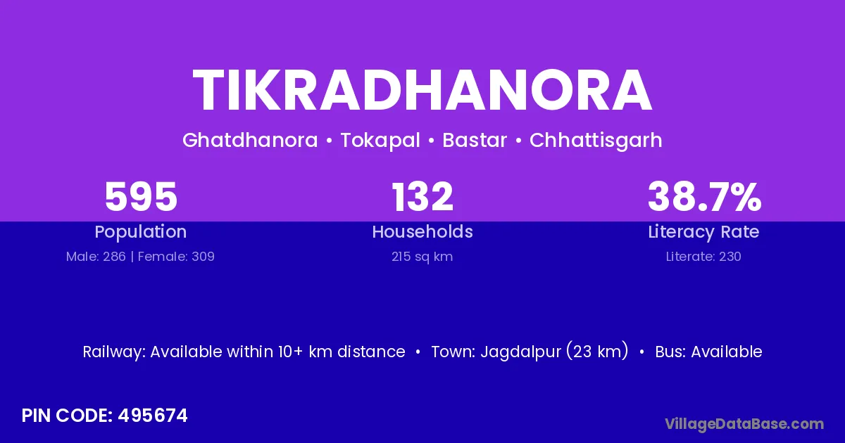 Jagdalpur (23 km) is the nearest town to Tikradhanora village for major economic activities and is located approximately 23 km away.