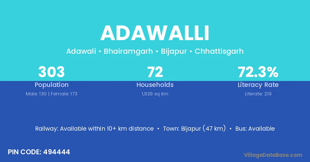 Adawalli village has a total population of 303 people, of which 130 are males and 173 are females.