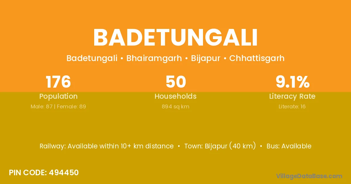 Bijapur (40 km) is the nearest town to Badetungali village for major economic activities and is located approximately 40 km away.