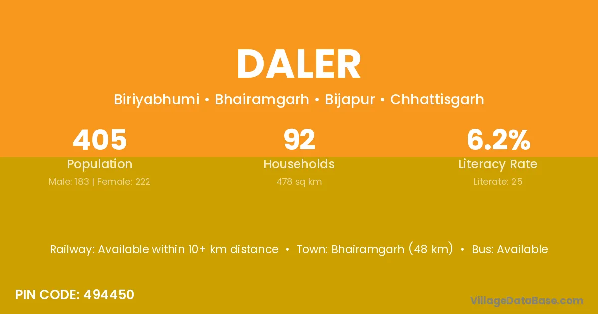 Bhairamgarh (48 km) is the nearest town to Daler village for major economic activities and is located approximately 48 km away.