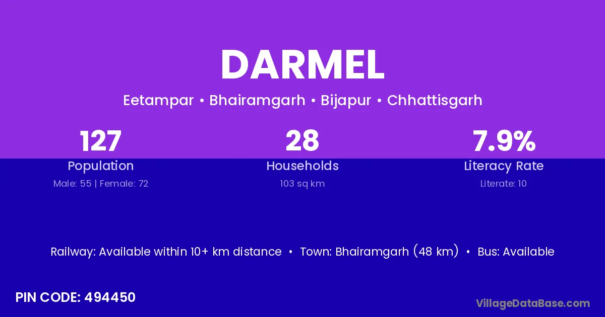 Bhairamgarh (48 km) is the nearest town to Darmel village for major economic activities and is located approximately 48 km away.