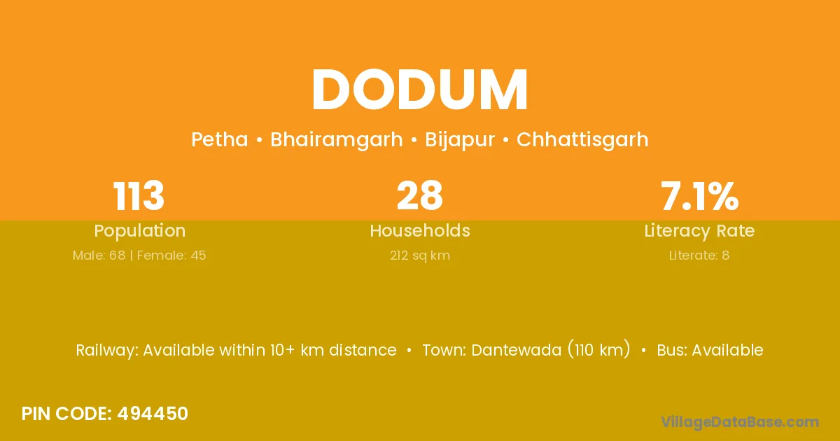 Dantewada (110 km) is the nearest town to Dodum village for major economic activities and is located approximately 110 km away.