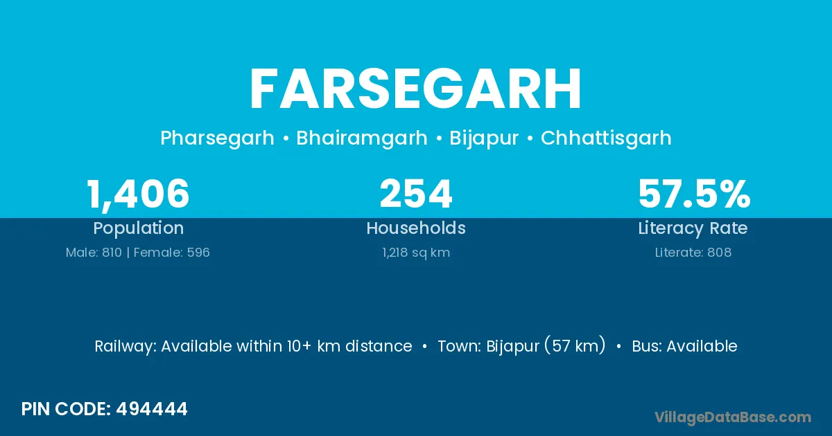 Bijapur (57 km) is the nearest town to Farsegarh village for major economic activities and is located approximately 57 km away.