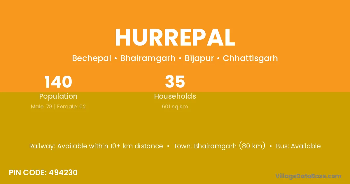 Bhairamgarh (80 km) is the nearest town to Hurrepal village for major economic activities and is located approximately 80 km away.