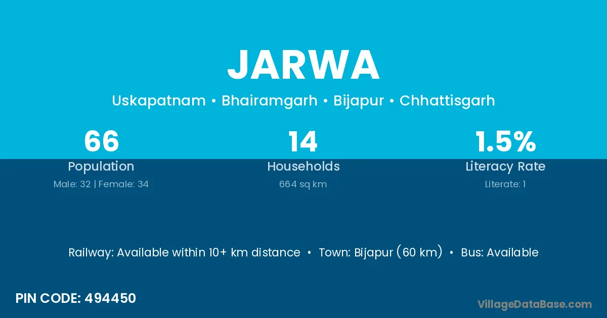Bijapur (60 km) is the nearest town to Jarwa village for major economic activities and is located approximately 60 km away.