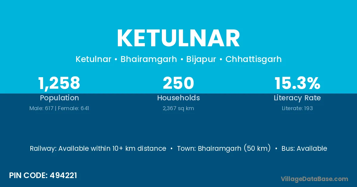 Bhairamgarh (50 km) is the nearest town to Ketulnar village for major economic activities and is located approximately 50 km away.
