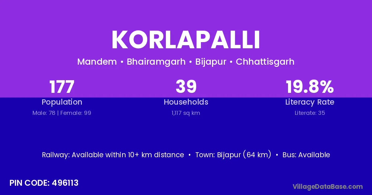 Bijapur (64 km) is the nearest town to Korlapalli village for major economic activities and is located approximately 64 km away.