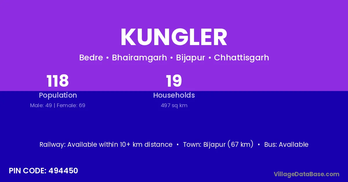 Bijapur (67 km) is the nearest town to Kungler village for major economic activities and is located approximately 67 km away.
