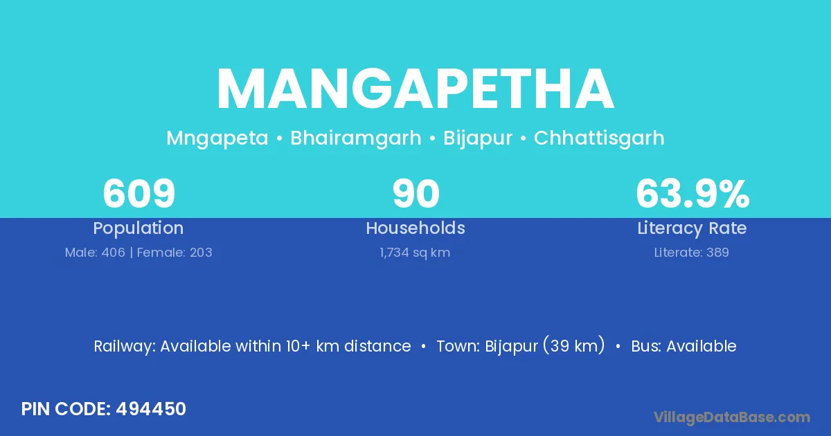 Bijapur (39 km) is the nearest town to Mangapetha village for major economic activities and is located approximately 39 km away.